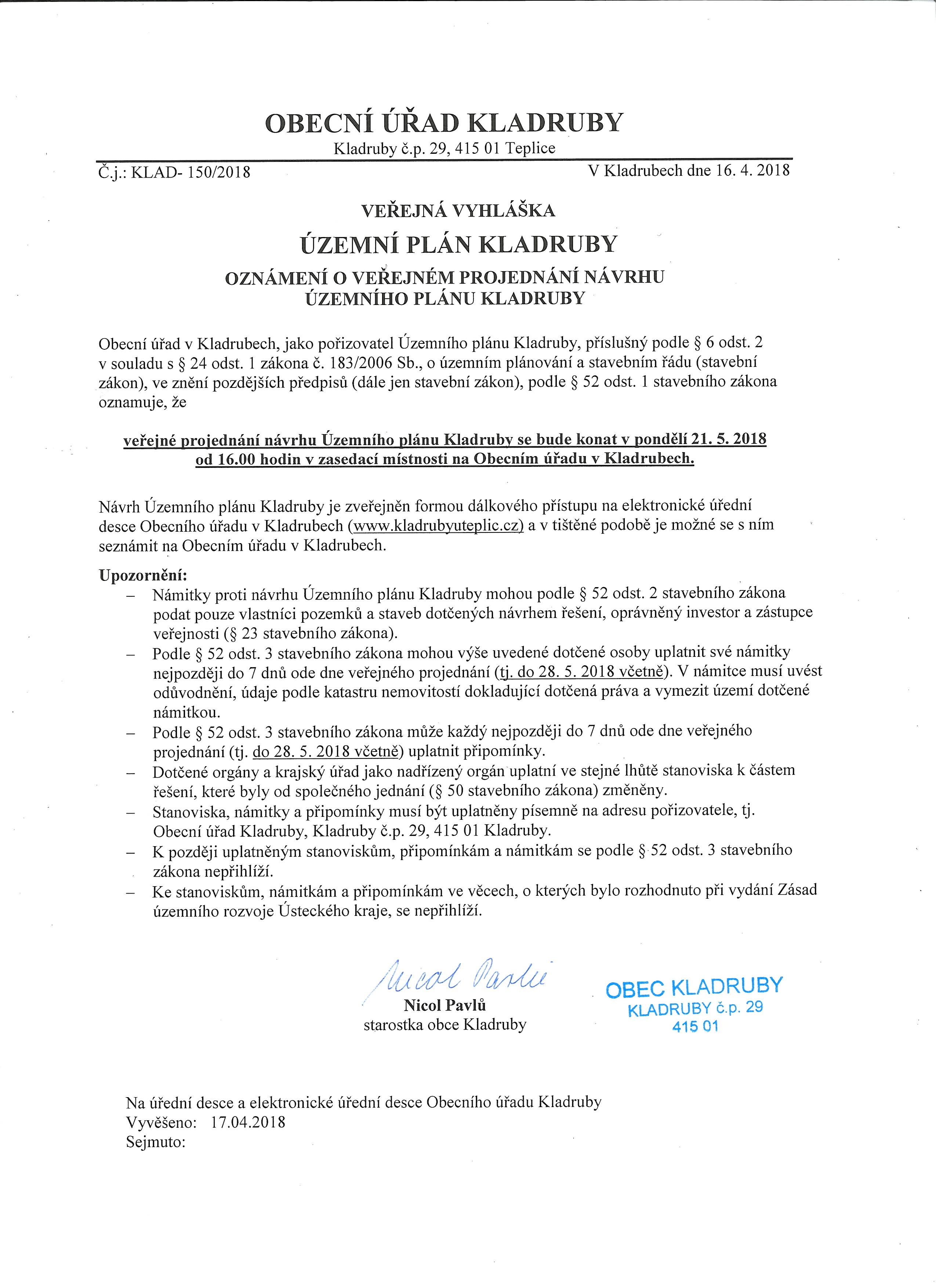 oznámení o veřejném projednání návrhu územního plánu Kladruby